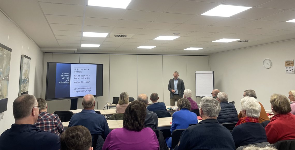 Nach einer kurzen Vorstellung des Volksbundes durch Bezirksgeschäftsführerin Saskia Glogowski konnte Dr. Bookjans in seinem Vortrag einen Einblick in die Wirkungsweisen des Erbrechts geben und den Unterschied zwischen Vorsorgevollmacht und Patientenverfügung erklären. Die Gäste nutzten die Gelegenheit, Fragen zu stellen und miteinander ins Gespräch zu kommen.