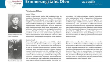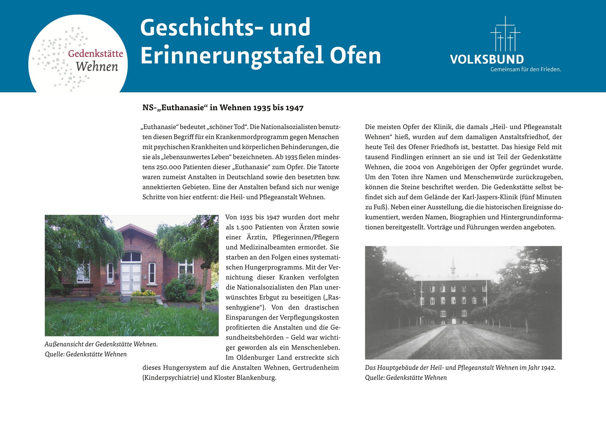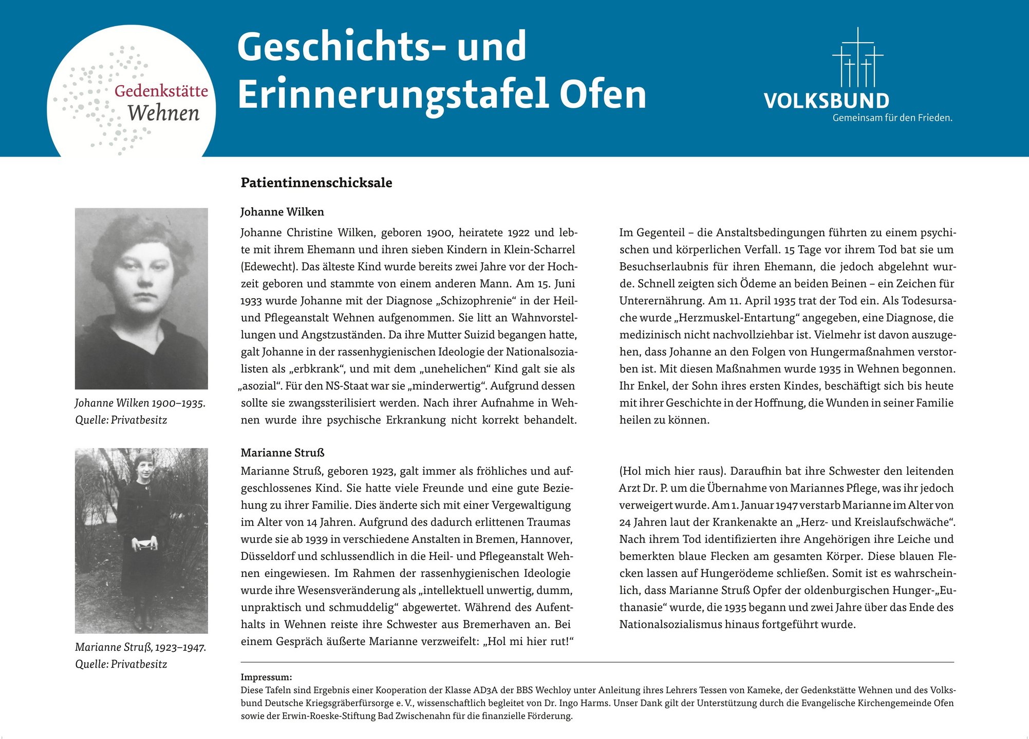 Nach einer Begrüßung durch Johanna Knoop, Bildungsreferentin des Volksbundes, folgten Grußworte der stellvertretenden Bürgermeisterin von Bad Zwischenahn, Frau Katharina Fischer-Sordon, von Lutz Renken für den Gedenkkreis Wehnen e. V. sowie von Manfred Götz von der Ev.- luth. Kirchengemeinde Ofen. Beiträge der Projektbeteiligten aus der Schule und von Walter Röbber rundeten das Programm ab. Röbber ist der Enkel der in Wehnen ermordeten Johanne Wilken, über deren Schicksal eine der Tafeln informiert.